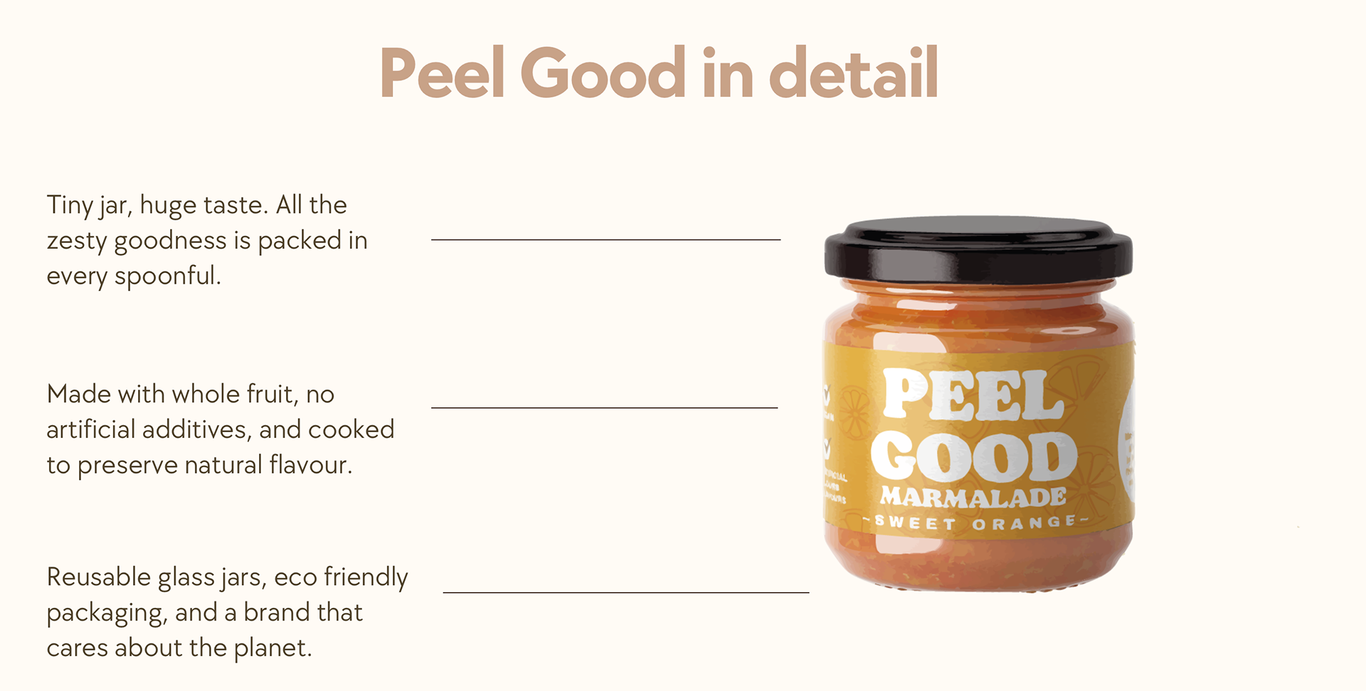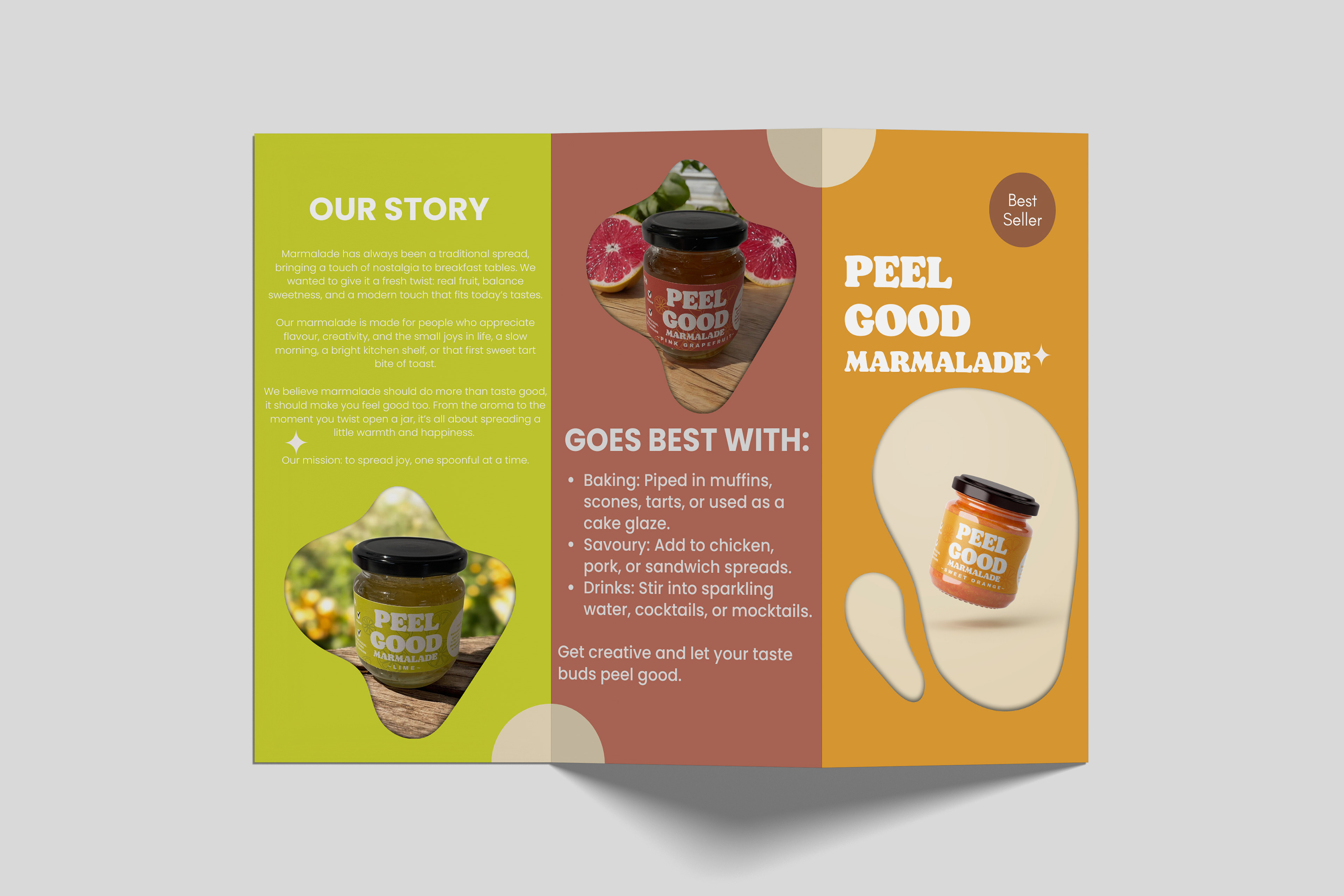 Peel Good is a marmalade brand for 20–28 year olds, the older side of Gen Z, mostly because they can afford it and care about health and wellbeing. Research shows people often don’t like eating the citrus peel, but our marmalade makes it tasty and delicious. Plus, orange peel is rich in natural vitamins and antioxidants, giving you a little boost with every bite.